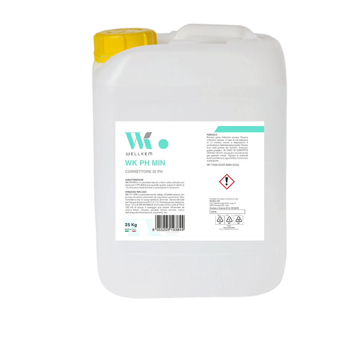 Il WK PH MIN è un prodotto liquido a base acida utilizzato per diminuire il PH dell’acqua quando questo supera il valore di 7,5. Previene intorbidimenti e incrostazioni o corrosioni.